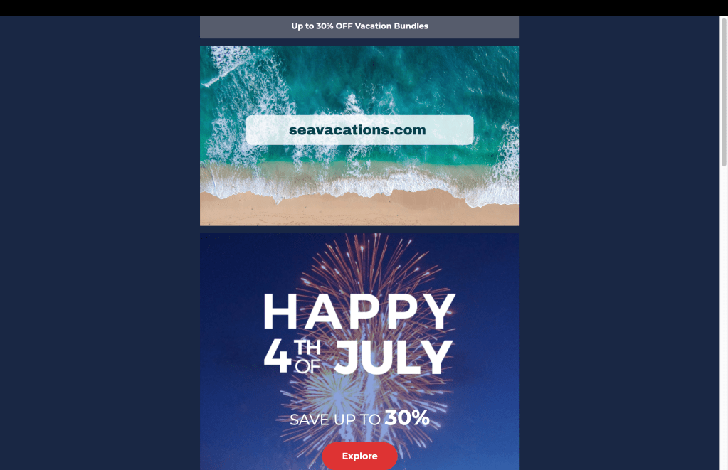 This email template example showcases a holiday promotion for a travel company. The design is meant to be fun and engaging. Sparking interest in booking a vacation by exciting package descriptions and photos. It offers a limited time promotion to steer prospective customers into taking action and booking a trip.