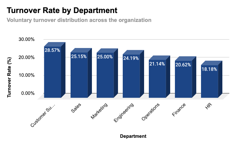 Investigated organizational turnover patterns to assess whether attrition was driven by individual employee factors or structural dynamics. Results showed elevated turnover concentrated in specific departments—particularly Customer Support—indicating role- and function-level drivers rather than individual dissatisfaction.