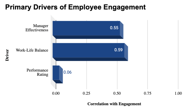 Analyzed employee engagement across departments, tenure groups, and job levels to identify where engagement risk is highest. Results showed that manager effectiveness and work-life balance are the strongest drivers of engagement, with lower engagement strongly associated with higher attrition risk.