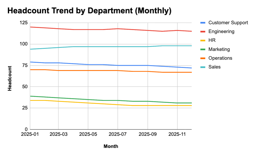 Evaluated hiring and attrition trends to support forward-looking workforce planning across departments. Results showed uneven headcount dynamics, with net declines in several functions driven by higher exits than hires, highlighting areas of potential capacity risk and the need for proactive planning.